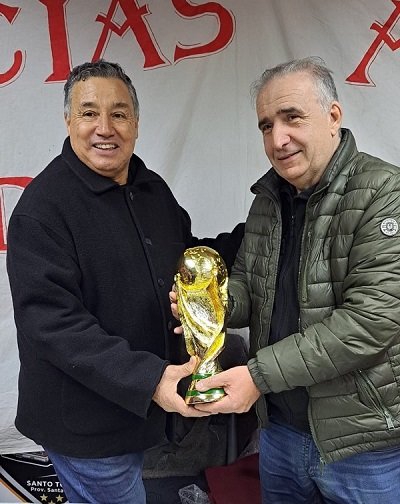 Juan Carlos “La Araña” Maciel y Ariel Sclafani de la Liga Profesional, junto a la réplica de la Copa del Mundo.